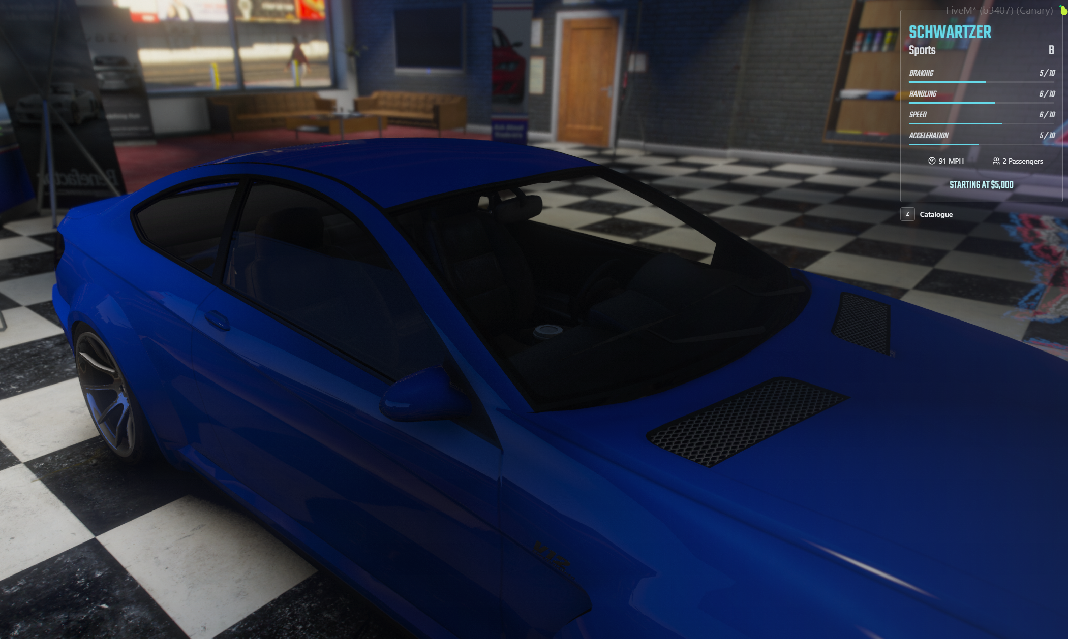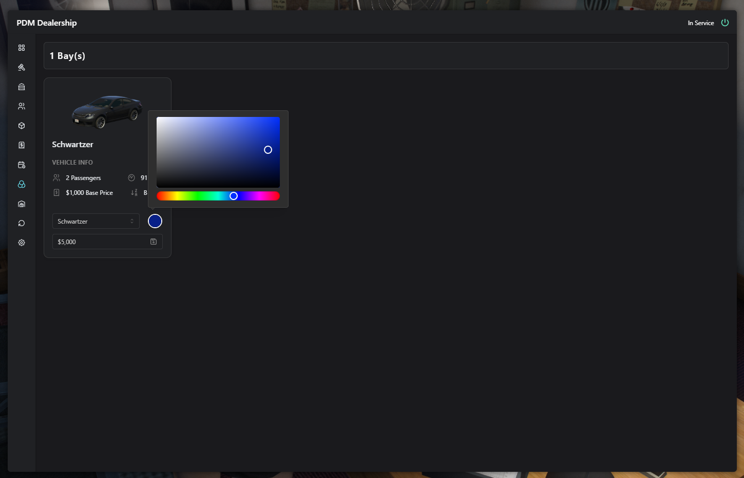 > In this tab, the dealership can manage its showroom bays — choose which vehicle model to display, customize its color, and set an individual price for each one. All changes are applied in real time.