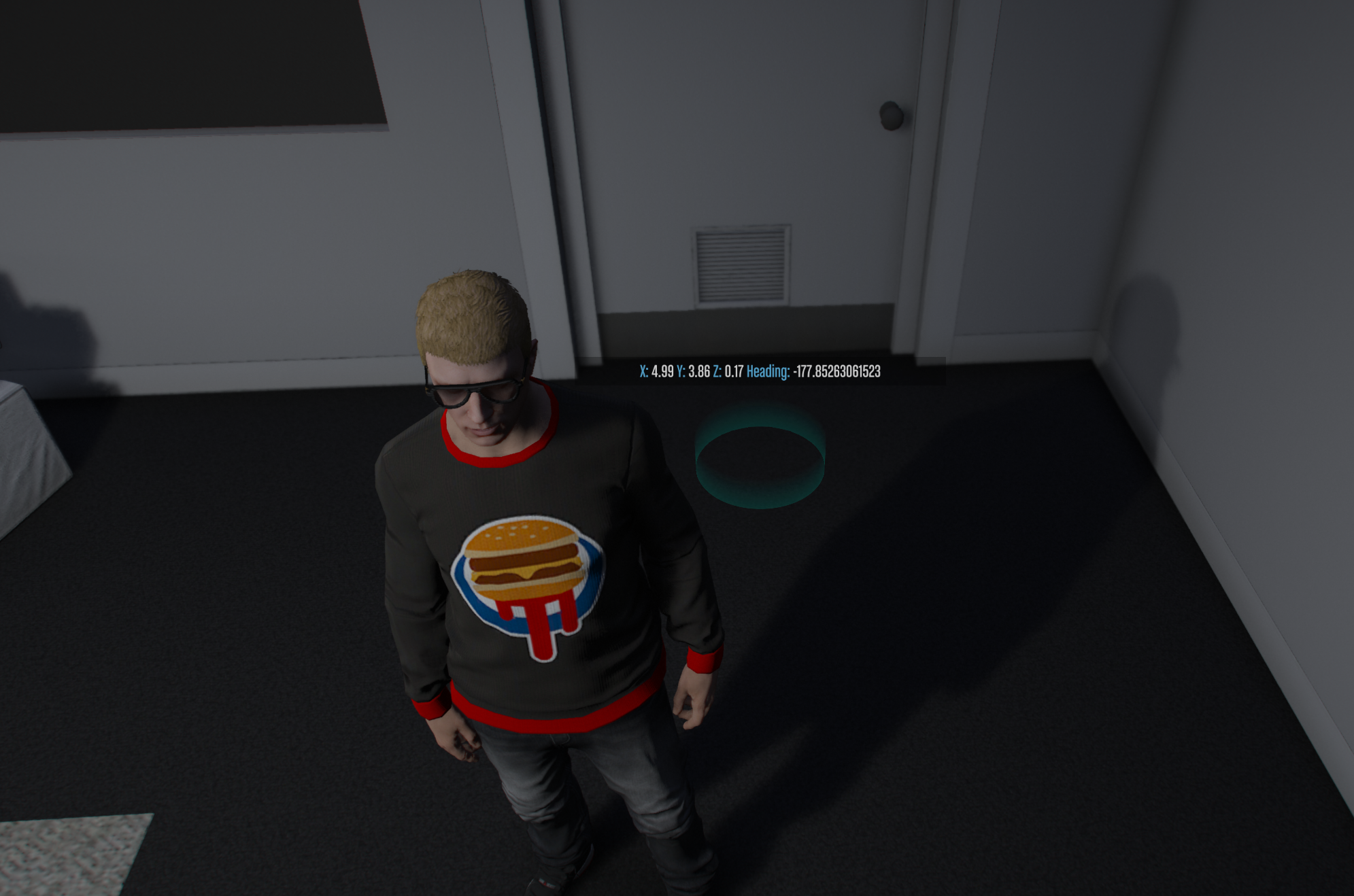 **4)** You will be spawned inside the shell and a blue marker will appear floating in front of you, this marker is used to retrieve coords, for example, go to the door and place the marker where you want the player to spawn when they enter the house: