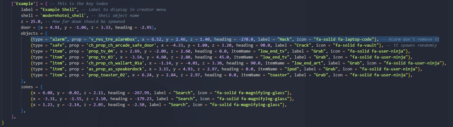 {type = "alarm", prop = 'v_res_tre_alarmbox', x = 6.14, y = -1.65, z = 3.15, heading = -180.44, label = "Hack", icon = "fa-solid fa-laptop-code"}, -- Alarm don't remove it
