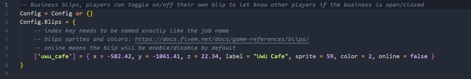 Business can enable/disable their blip, you can use this feature by adding manually all business blips to the Config.Blips table, make sure to follow the format of the uwu\_cafe example: