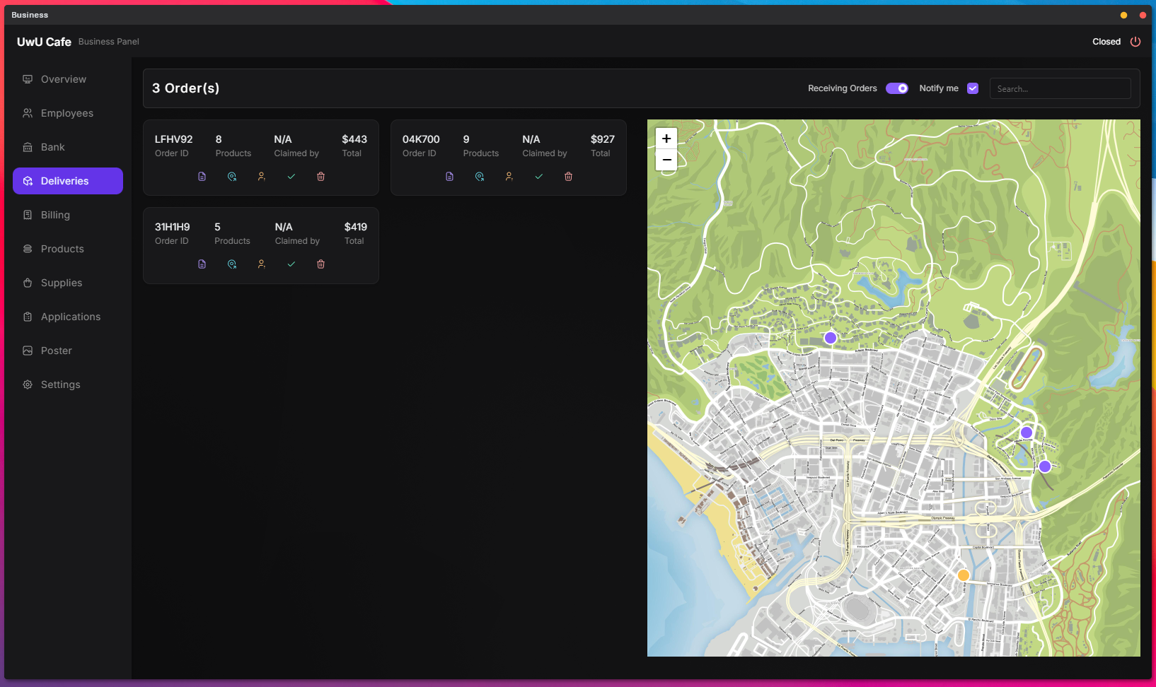 Claim Order: Assigns the order to the employee who claimed it. This is mainly for tracking purposes—to know who is handling which delivery. It does not restrict the order completion to that employee only.