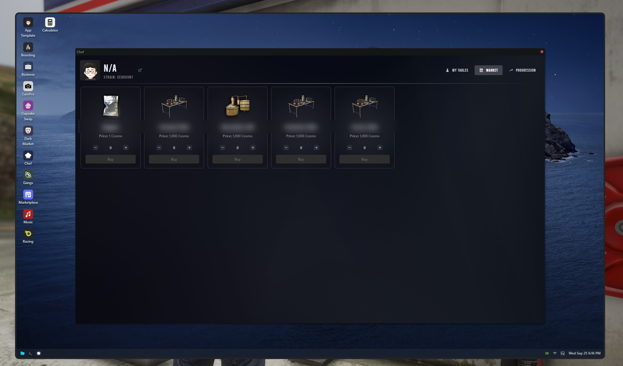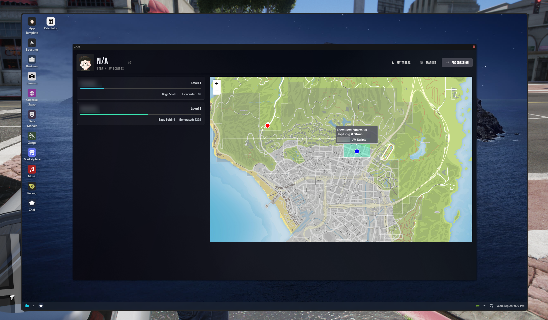 > * On the left panel you can see a list of all the drugs you have cook, your current cooking level for that specific drug, bags sold from that drug, generated income result of selling that drug and strain.