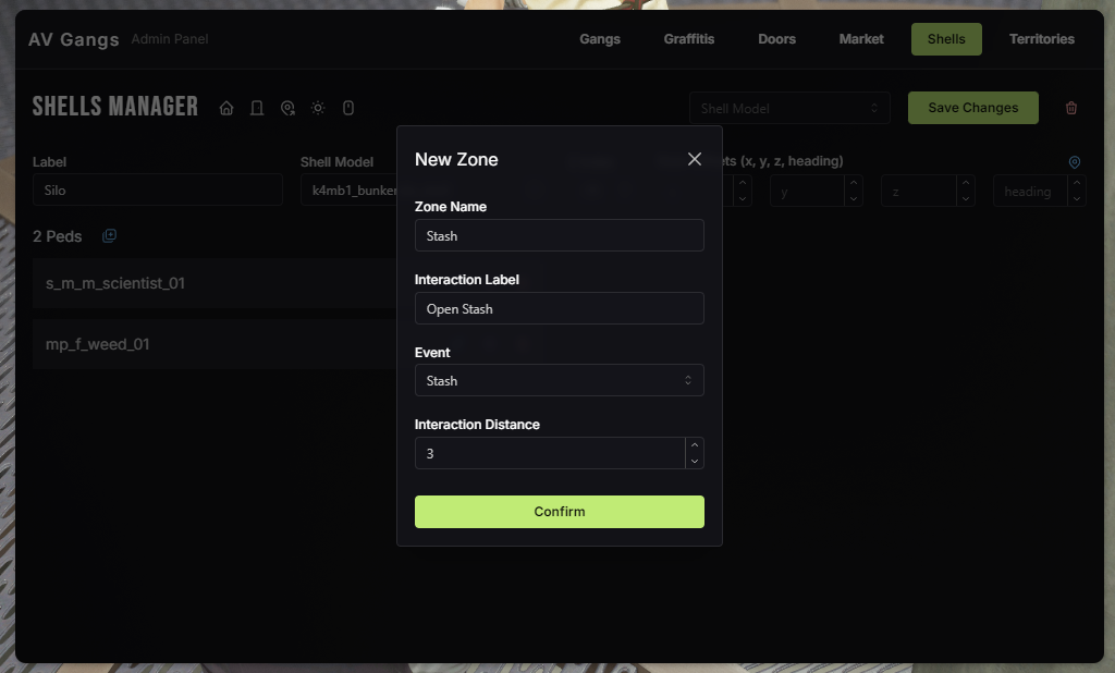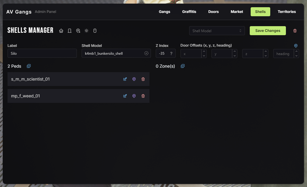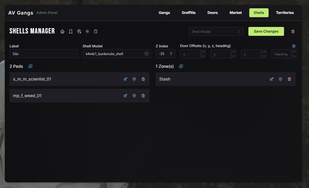 * **Ped Model:** When pressing **M** you can cycle thru all available ped models, you can add more in `server/editable/_shells.lua > Config.ShellPeds`
